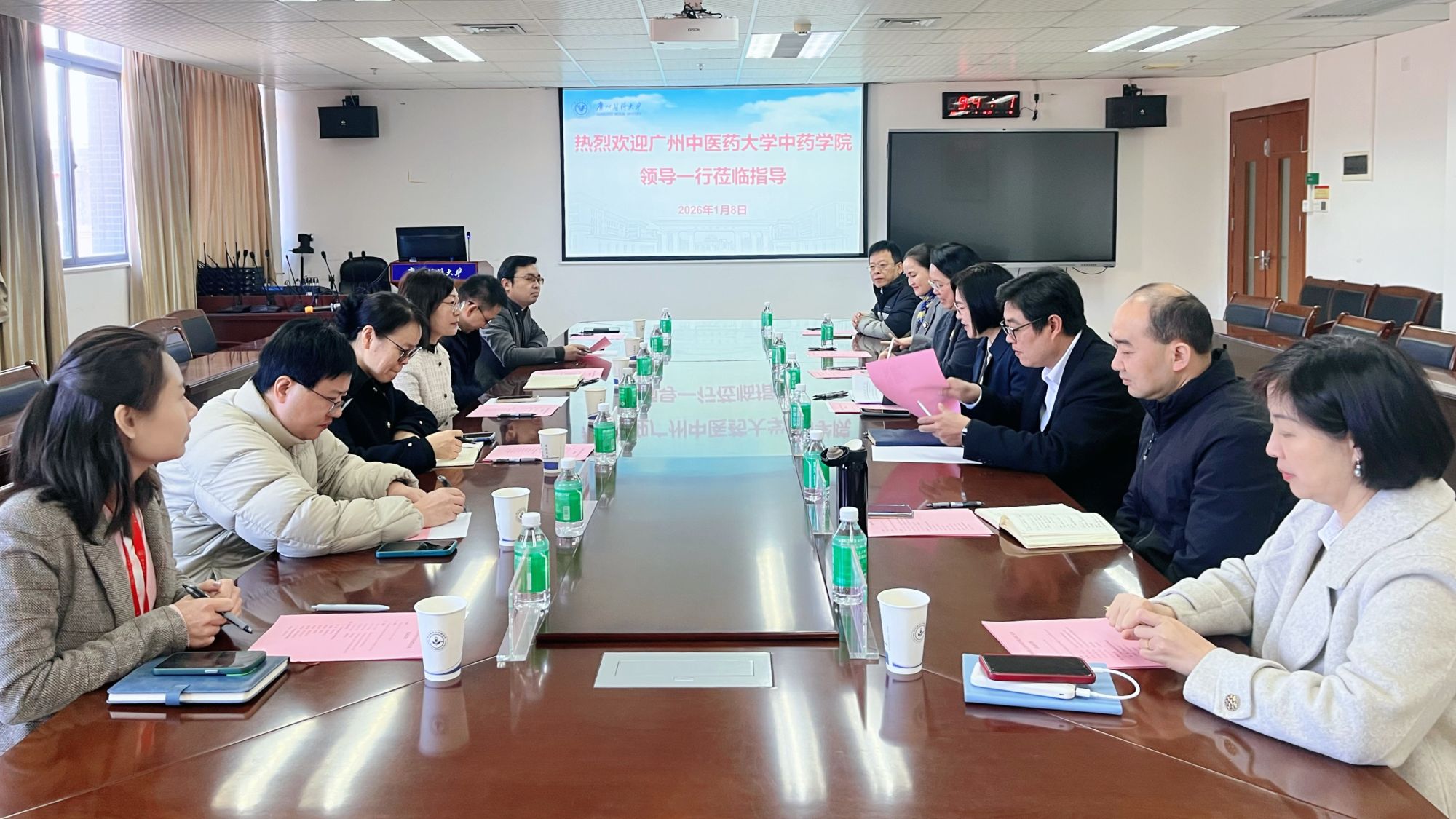2026年1月8日上午,广州中医药大学中药学院党委书记张娟、党委副书记王建刚、副院长靳红磊、熊天琴等一行7人莅临我院,开展专题调研与交流座谈。座谈会在A1-648药学院会议室举行。我院党委书记吴他凡主持会议并致欢迎辞,易伟副院长(主持工作)、罗晓明党委副书记及各系、行政办公室负责人参加了交流活动。