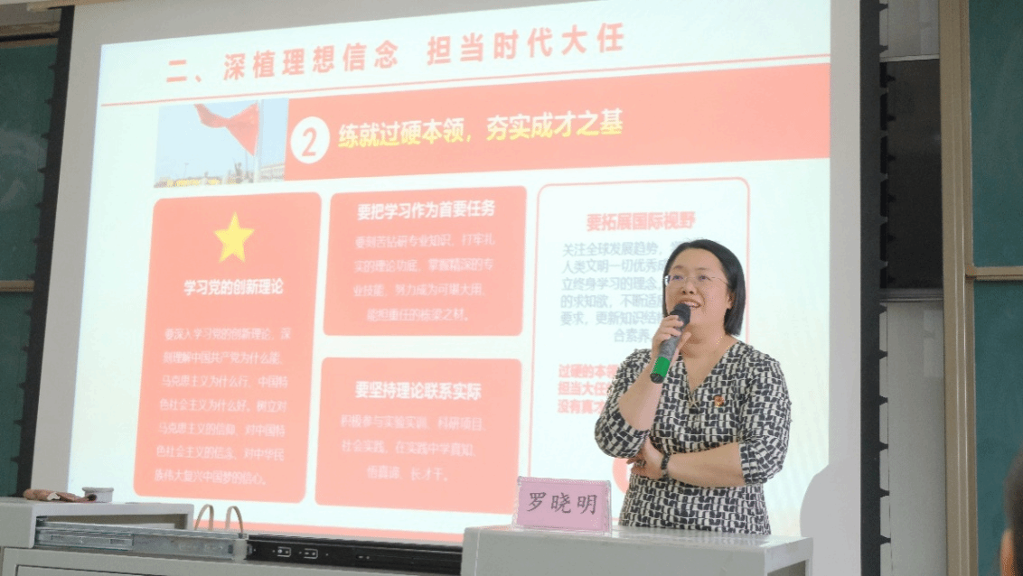 面向本科新同学,罗晓明副书记以“如何度过你的大学生活?”为切入点,带领同学们回溯党的百年奋斗历程,深刻感悟“革命理想高于天”的信仰力量,引发新生“你想成为怎样的人?”的思考,进一步明确新学期的目标和方向,用实干和担当书写无愧于时代的青春篇章,以实际行动践行“请党放心,强国有我”的铮铮誓言。