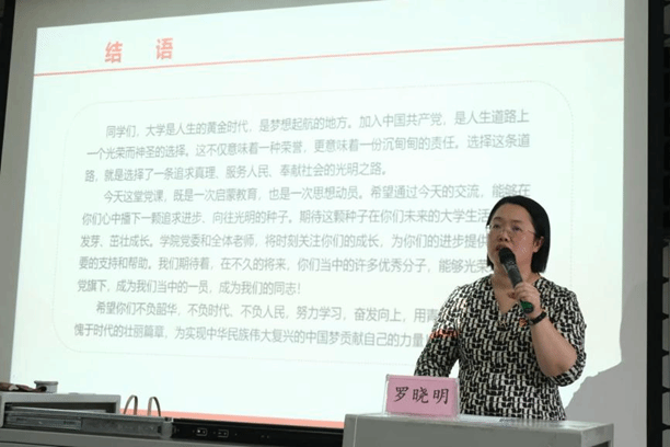 在党课中,罗晓明副书记带领全体新生回溯党的光辉历程,从开天辟地的建党伟业到革命年代的理想火种,深刻阐释“革命理想高于天”的信仰力量。她强调,药学人的理想信念不仅是学术追求的精神支撑,更是守护人民健康、推动医药事业发展的责任担当。同时她详细讲解了发展党员程序,重点阐释“树立正确入党动机”的核心要义,引导新生以“为人民服务、为医药事业奉献”为初心,在思想上先入党,以实际行动争取早日成为一名合格的共产党员。